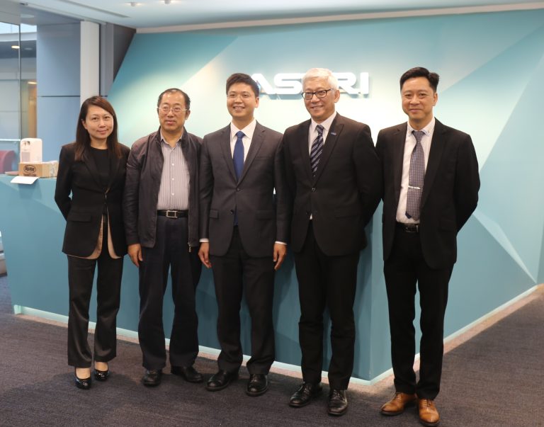 Mr Zhang Ke Ke (2nd from left), President of The Shenzhen-Hongkong Union For Promoting Science and Technology and Executive President of PKU-HKUST Shenzhen-Hongkong Institution, together with Dr Liu Zhiyong (Middle), Deputy District Mayor of Futian District People’s Government of Shenzhen Municipality visited ASTRI on 25 April 2017 and discussed with Dr Frank Tong (2nd from the right), CEO of ASTRI, Dr Meikei Ieong (1st from the right), CTO of ASTRI and Ms Eunice Cheng (1st from left), Head of Public Affairs about the possibilities of future co-operations between the two cities. The delegates also visited the R&D projects related to Financial Technologies in ASTRI.