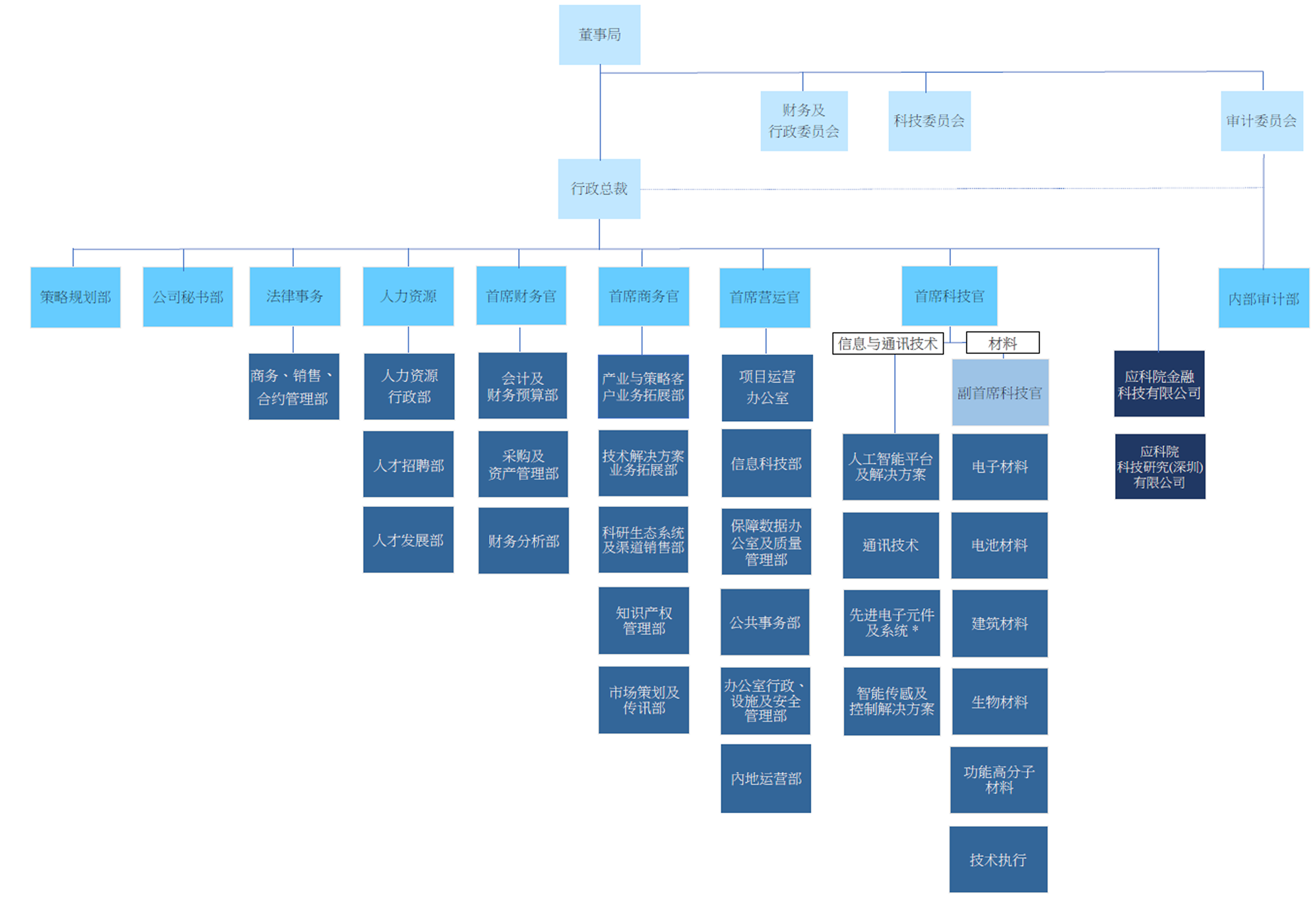 应科院由行政总裁领导,并向董事局负责公司的整体管理。行政总裁旗下有首席科技官、首席营运官、首席商务官及首席财务官协助,负责技术部门、商务、传讯、财务、行政管理以及其他职责。