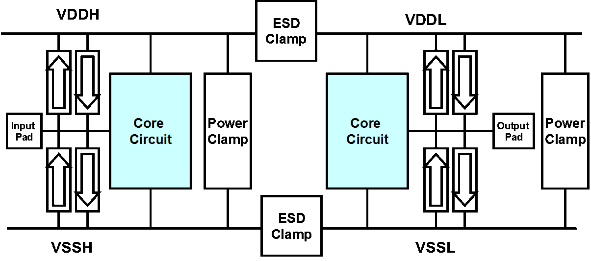 Whole chip ESD protection scheme is designed to provide effective ESD protection for integrated circuits fabricated in several technology nodes. Protection devices are designed and verified using TCAD based process and device simulation, which are utilized in I/O ESD protection circuit and power clamps. Developed ESD protection schemes can provide effective ESD protection up to 8000V in Human Body Model (HBM) test without latch-up problem. Compact model for ESD protection devices is also provided to enable fast and efficient ESD simulation with core circuit.